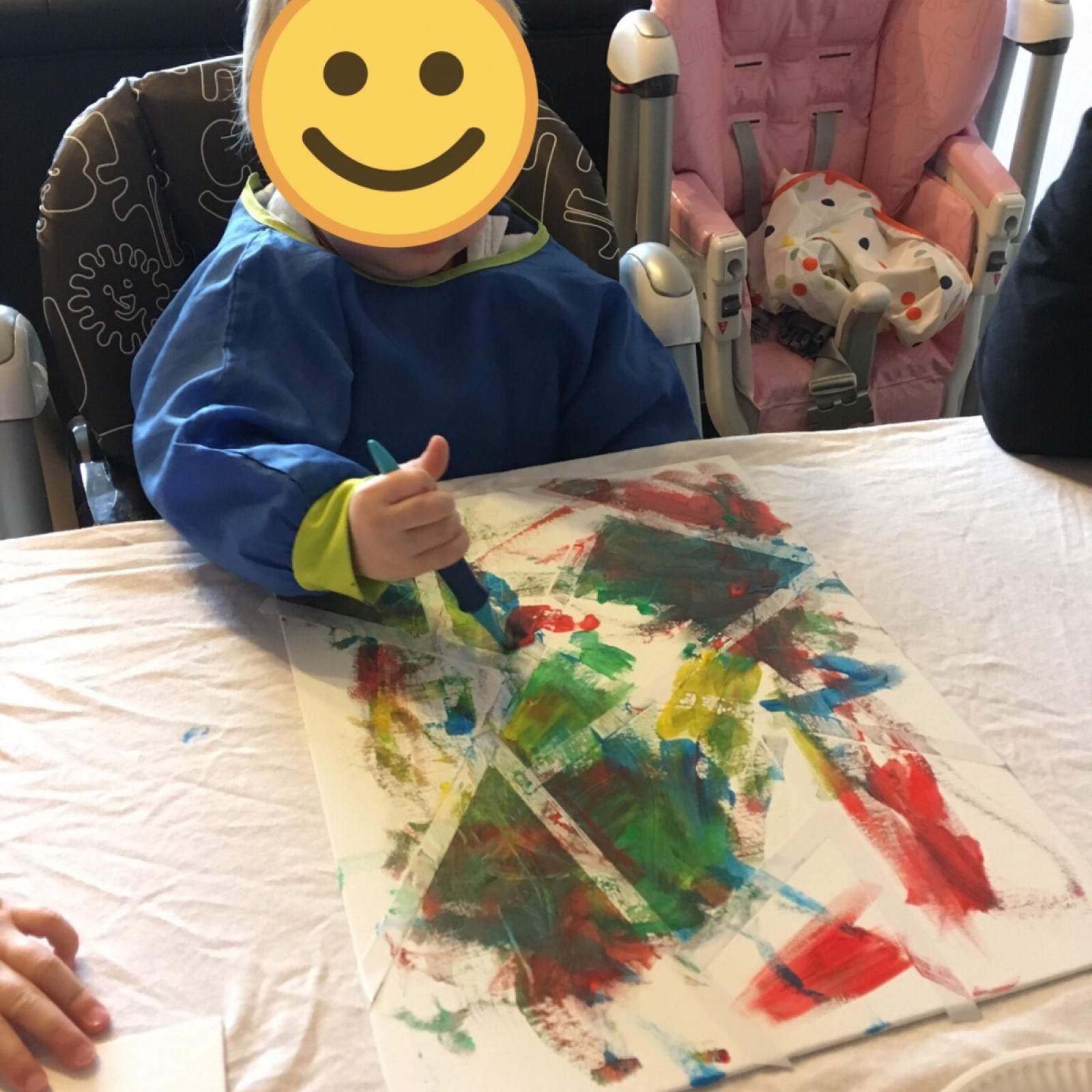 Ein kleiner Bereich des Raumes ist abgeteilt für den Esstisch. Hier können die Kinder in altersgerechten Kinderstühlen die Mahlzeiten einnehmen. Dabei lege ich großen Wert darauf, das die Kinder versuchen selbständig zu essen. Je nach Alter und in Absprache mit den Eltern dürfen die Kinder mit Fingern essen oder sich mit Löffel oder Gabel ausprobieren.